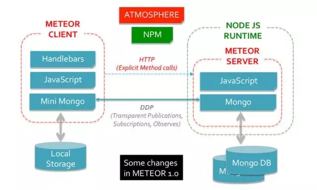 Meteor(version:1.0)的另一個(gè)特點(diǎn)是它通過在手機(jī)內(nèi)部存儲(chǔ)器中實(shí)現(xiàn)其 miniMongo 數(shù)據(jù)庫來維護(hù)數(shù)據(jù)的本地副本。此外,所有的電話到服務(wù)器數(shù)據(jù)通信和同步由 Meteor 提供。(miniMongo 是 MongoDB API 的 JavaScript 實(shí)現(xiàn)。)下面是架構(gòu):