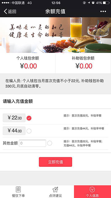 2、系統賬戶存在補助錢包與現金錢包,員工可以通過微信支付充值。