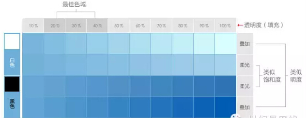 上圖示例中,調整疊/柔模式的黑白色塊的不同透明度(取10%到100%整數值為例)就可以得到差異較明顯的40種配色,通過這種技巧,理論上每一種顏色都可以輕易獲得無窮盡的"天然配色",并且是"0失誤"!)