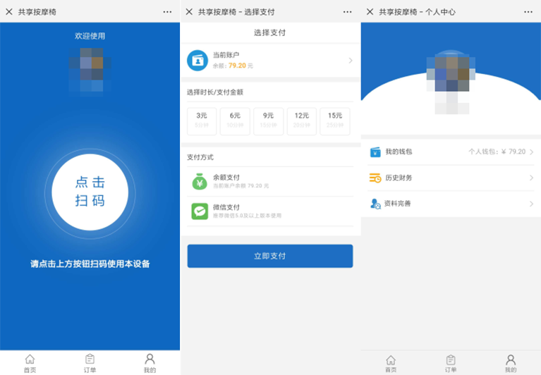 ,小程序即掃即用的特點讓用戶打開微信就可以完成支付和使用。那么一款共享按摩小程序需要搭載哪些功能呢?