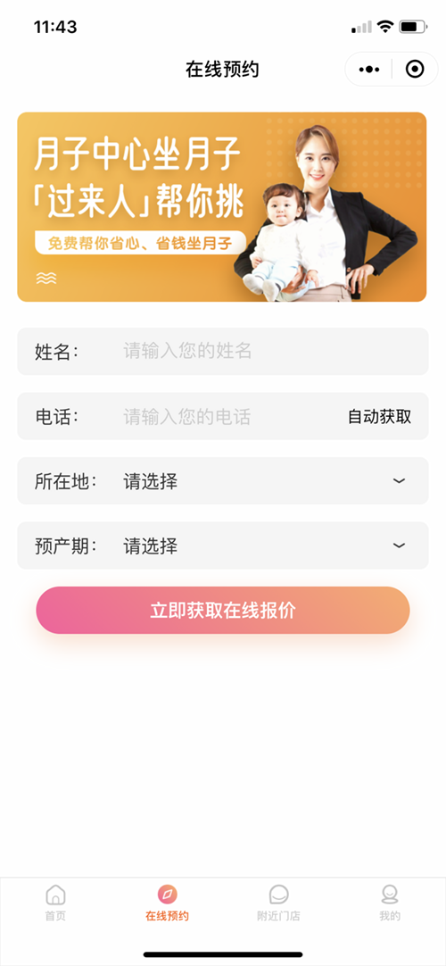 不知道選擇哪個月子中心,可以填寫姓名、電話、所在地和預產期等信息,在線獲取報價。