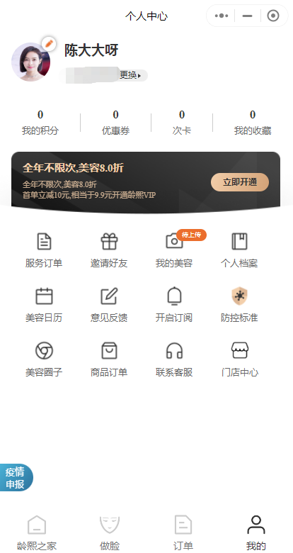 包括個人信息、我的積分、優惠券、次卡、我的收藏、會員開通等信息